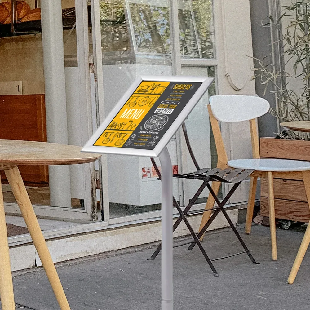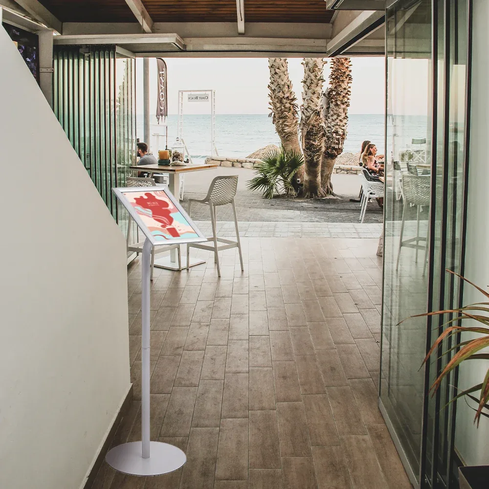 Progettato con una forma sottile che si adatta perfettamente a qualsiasi ambiente. La sua cornice a scatto permette di inserire facilmente menù, poster, fogli e molto altro ancora. Inoltre, l’assemblaggio di questo espositore è estremamente semplice e non richiede l’uso di attrezzi.