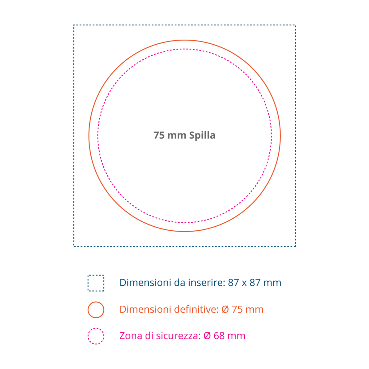 Rendi unico il tuo messaggio con le nostre spille da 75mm, la scelta perfetta per distinguerti e seguire la moda del momento. Con un diametro generoso di 75mm e un’ampia area di stampa di 87x87mm, il tuo design, logo o messaggio sarà sempre ben visibile, attirando l’attenzione in ogni occasione.