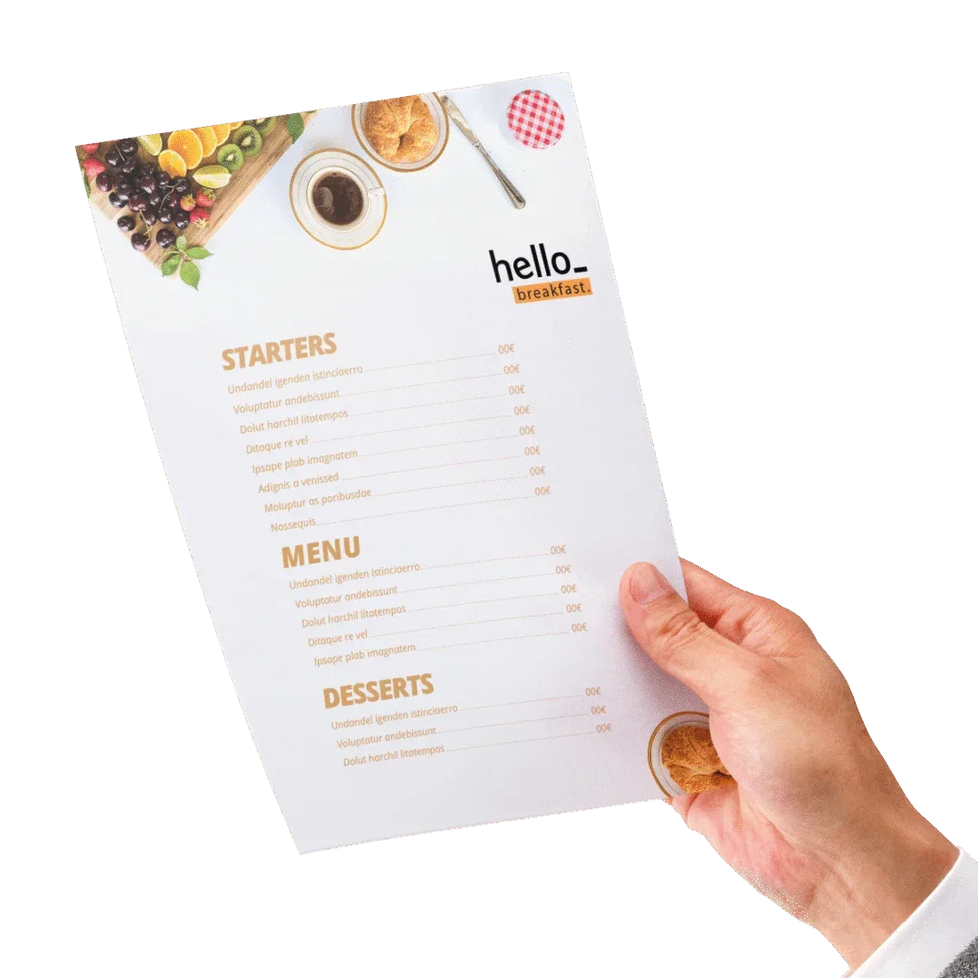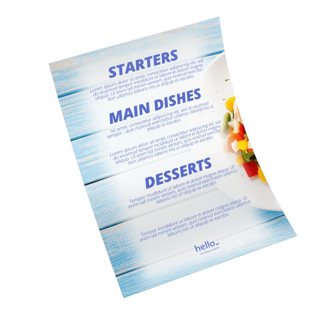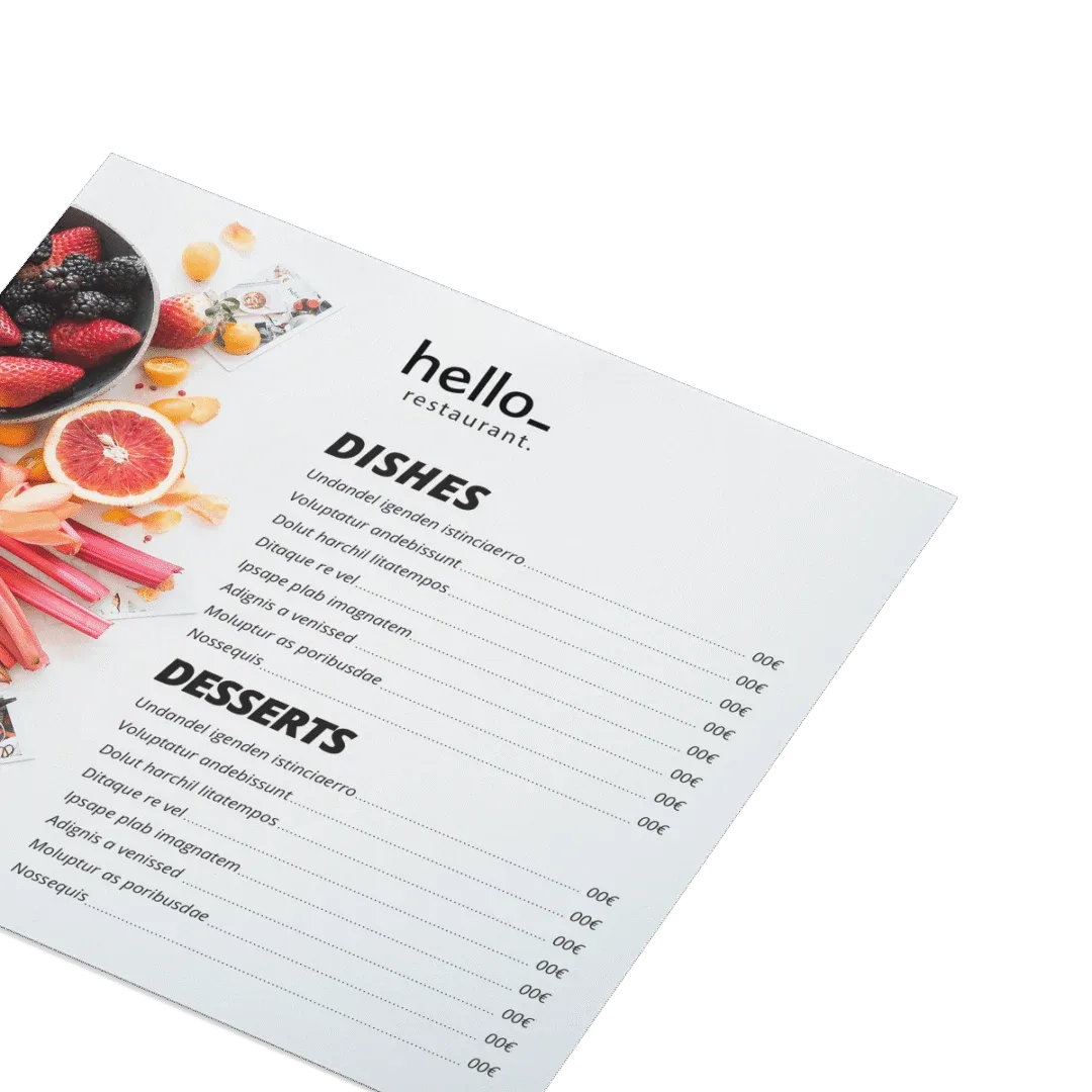 Menù una pagina. Ti serve un veloce cambio di look o hai da poco aperto un nuovo locale? Questo menù semplice diventa biglietto da visita. Scegli tra i diversi formati e tipi di carta quelli che fanno al caso tuo e preparati a sfoggiare i tuoi nuovi menù!