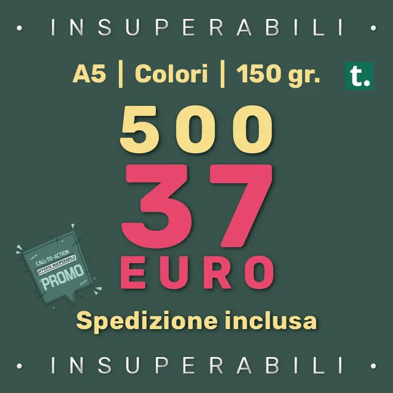 Volantini A5 Insuperabili. in quantità da 500 a 2000 copie per ottimizzare tutti i costi, dalla stampa alla spedizione. Da 37 a 59 euro + iva, con la spedizione gratuita. Il volantino è sempre uno strumento di marketing efficace per promuovere un prodotto o un servizio. Necessario se il budget è limitato.