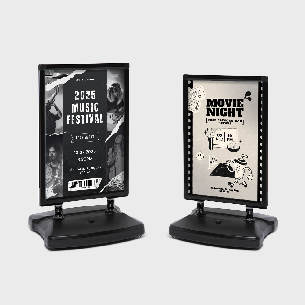 Cavalletti pubblicitari da esterni. Il Windtalker® City Splashproof è progettato per la pubblicità all’aperto e presenta una base in plastica per il riempimento con acqua o sabbia, spesse molle in metallo per la stabilità e un sistema di cornici a clip per una facile sostituzione del poster bifacciale. Disponibile in formato A1 e in colore nero, questa grafica resistente alle intemperie garantisce che il tuo messaggio rimanga visibile in qualsiasi condizione.